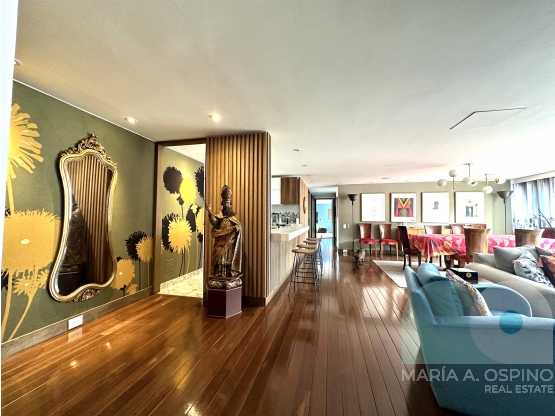Cocina abierta, amplios ventanales ( todo el apartamento tiene ventanas termoacústicas nuevas). Cuarto y baño de servicio. Espectacular vista 360. 3 parqueaderos. Acceso al edificio por la Cra 5ta y la Cra 7ma, calle 72. A poco pasos de la Zona G.