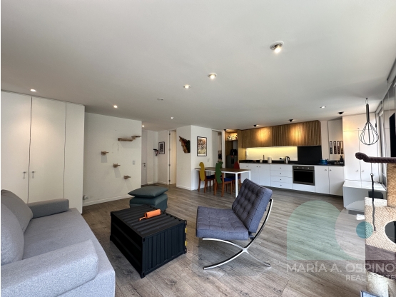 Vendemos espectacular apartamento totalmente remodelado (incluyengo tuberías eléctricas y hidráulicas), en 5to piso exterior con vista a los cerros orientales. Cuenta con 1 habitación muy amplia con baño privado, sala comedor con chimenea a gas, cocina abierta con estufa de inducción, zona de lavandería independiente amplia, baño social. Acabados modernos, linda iluminacion indirecta, ventanas termoacústicas. 1 parqueadero cubierto independiente y depósito. El edificio tiene la recepción y el ascensor totalmente remodelados. Vigilancia 24/7. Excelente ubicación frente a un parque.