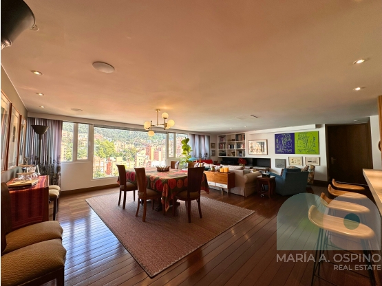 Cocina abierta, amplios ventanales ( todo el apartamento tiene ventanas termoacústicas nuevas). Cuarto y baño de servicio. Espectacular vista 360. 3 parqueaderos. Acceso al edificio por la Cra 5ta y la Cra 7ma, calle 72. A poco pasos de la Zona G.