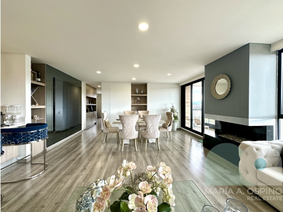 Vendemos excelente apartamento completamente exterior con vista 180 grados a toda la ciudad con sol de mañana y de tarde. Cuenta con 3 habitaciones cada una con baño privado, estudio, sala comedor amplia con chimenea a gas y balcón el cual tiene mesón con BBQ privado. Cocina abierta con zona de ropas independiente. Baño social. Cuenta con varios acabados superiores a los entregados por la constructora, y algunos muebles empotrados, puerta de seguridad con cerradura digital. Tiene 2 parqueaderos en línea y depósito.